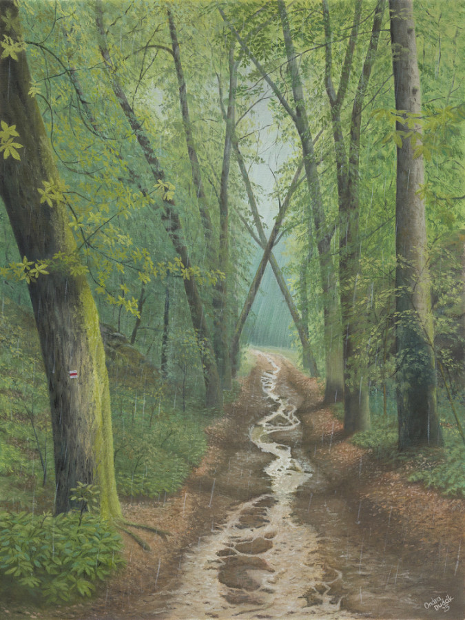 Allee Jánský vrchÖlgemälde 45 x 60 cm, 2025Die Allee Jánský vrch bei Javorník entstand um 1840 bei der Erweiterung des englischen Parks, der das Schloss Jánský vrch umgibt. Die Baumreihe säumt den Weg, der vom Park zur nahe gelegenen Kapelle führt, die 1893 von Frau Lorencová als Dank für das Überleben ihres Sohnes erbaut wurde. Die Allee, die hauptsächlich aus Ahornbäumen besteht, bildet selbst das Tor zu den Rychlebské-Bergen.