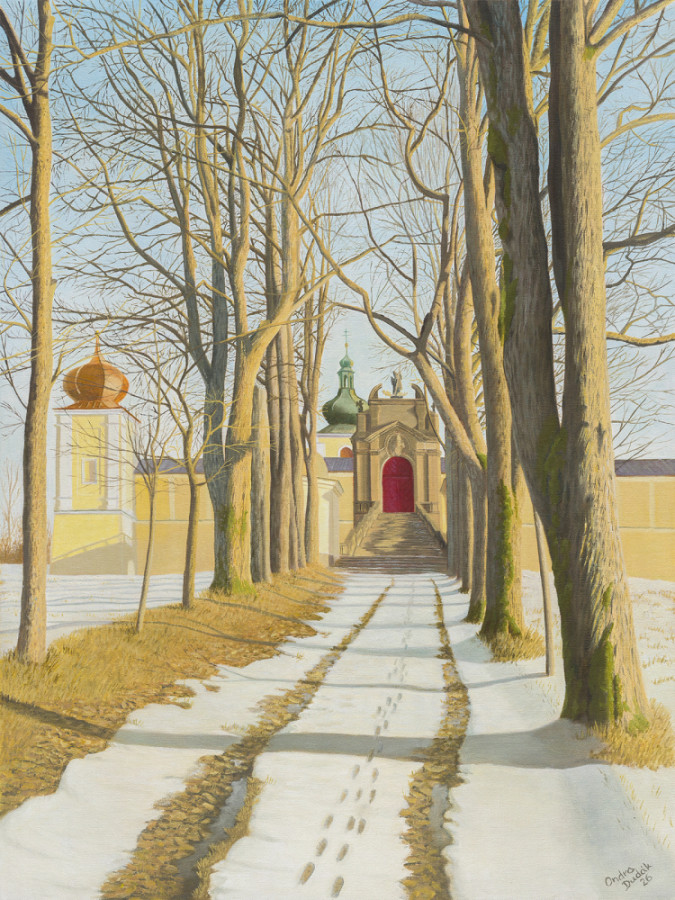 Allee zum KlosterÖlgemälde 45 x 60 cm, 2026Die Allee zum Kloster auf dem Berg der Mutter Gottes bei Králíky wurde 1705 als Teil der barocken Gestaltung des Wallfahrtsgeländes und zur Einrahmung des Kreuzwegs angelegt, der vom Rand der Stadt Králíky direkt zur Wallfahrtskirche führt. Sie besteht aus Linden, Ahornbäumen, Eschen und Ebereschen, die die Pilger bis zum Gipfel des Hügels begleiten. Im Jahr 2023 wurde diese Allee zur beliebtesten Allee der Tschechischen Republik gekürt.