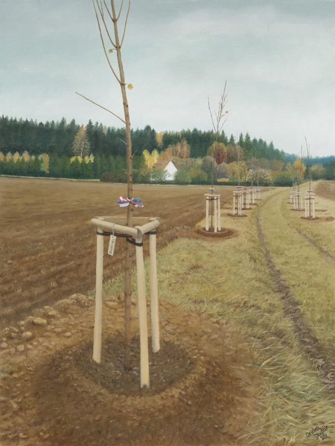 Allee der FreiheitÖlgemälde 45 x 60 cm, 2025Die Allee der Freiheit beim Lager Vojna bei Příbram habe ich 2021 als symbolische Erinnerung an die Opfer der Unfreiheit und gleichzeitig als Hoffnung auf eine bessere Zukunft mitgepflanzt. Die jungen Bäume säumen den Weg zum ehemaligen Arbeitslager und knüpfen damit an die Tradition von Alleen als Orte der Erinnerung und Verbindungslinien in der Landschaft an. Die Neuanpflanzung verbindet die pietätvolle Bedeutung des Ortes mit seinem landschaftlichen und natürlichen Wert und wird so zu einem lebendigen Denkmal.