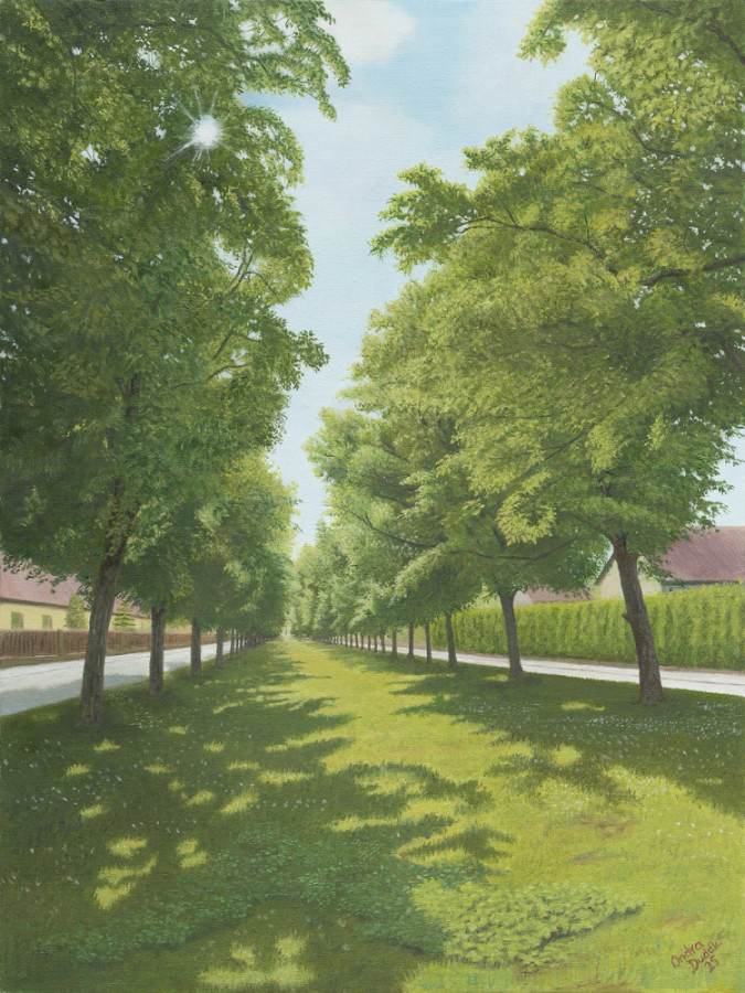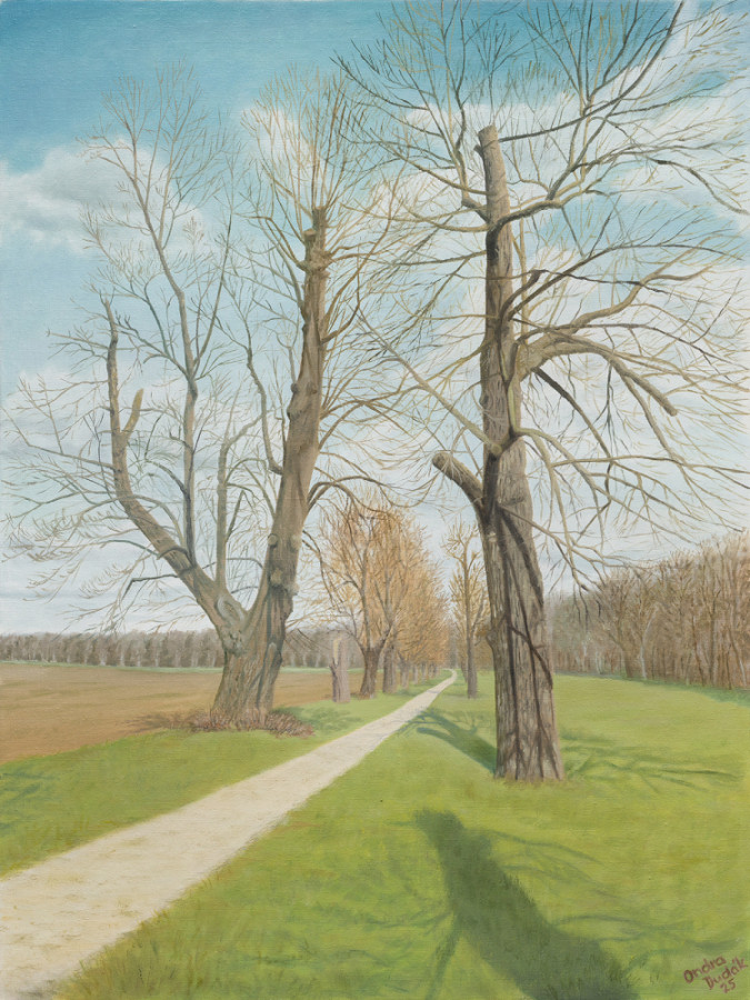 RitterwegÖlgemälde 45 x 60 cm, 2025Der Ritterweg ist eine doppelte Reihe von Ahornbäumen, die zu Beginn des 20. Jahrhunderts von der Familie Berchtold gepflanzt wurde und in der ersten Reihe für Fußgänger und in der zweiten Reihe für Kutschen gedacht ist. Er verbindet Buchlovice mit der Burg Buchlov. Nach der Verstaatlichung des Familienbesitzes wurde die Allee lange Zeit vernachlässigt, bis sie 2012–2013 vom Tschechischen Naturschutzverband restauriert wurde, der sie säuberte und neue Ahornbäume pflanzte.