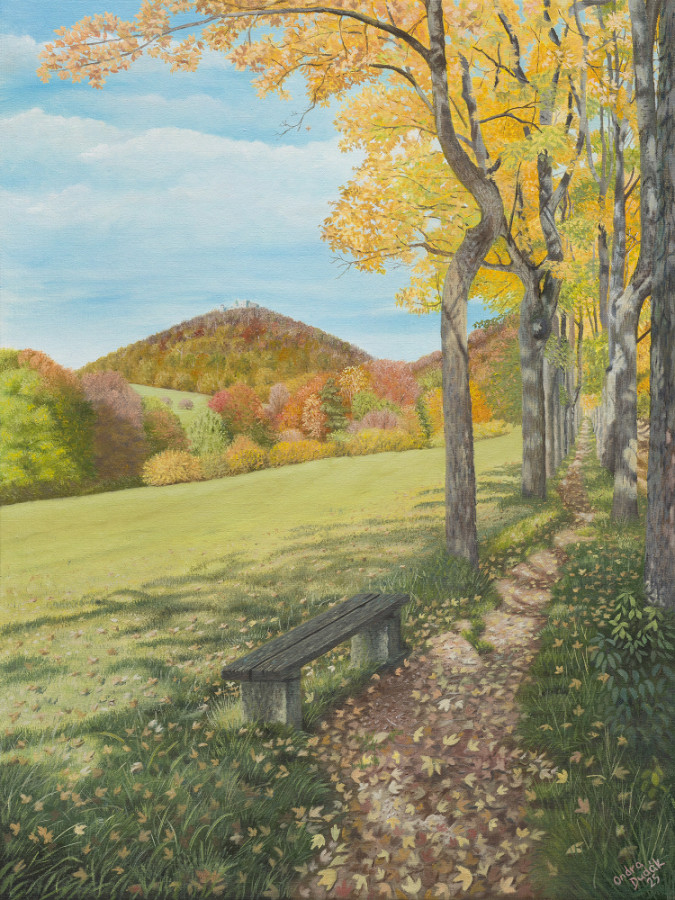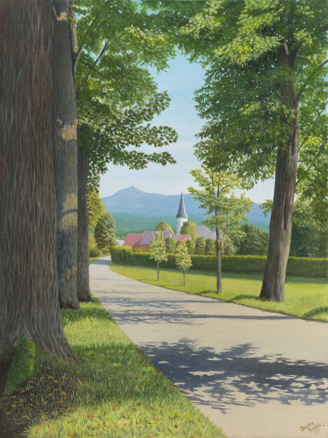 Osečná AlleeÖlgemälde 45 x 60 cm, 2025In Tschechien gibt es unzählige Alleen und Baumreihen, die wir beim Fahren auf den Straßen gar nicht bemerken, die aber dennoch den Blick auf markante Dominanten der Landschaft freigeben. Diese unscheinbare Allee bei Osečná ist ein Beispiel für einen solchen Ort – sie wurde offenbar nicht von einer bedeutenden Persönlichkeit angelegt und hat keinen berühmten Namen, bietet jedoch einen atemberaubenden Blick auf die historische Stadt Osečná und den ikonischen Ještěd, das Wahrzeichen der Region Liberec.